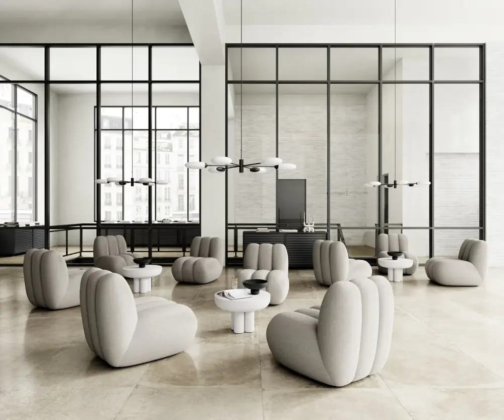 The chandelier’s opaque finish adds a touch of elegance and sophistication to its overall design, making it a standout piece in any setting. The Salon Grande Chandelier’s structure includes a series of intricately arranged arms, each supporting a beautifully shaped shade. These shades are designed to diffuse light softly and evenly, creating a warm and inviting ambiance. The chandelier’s minimalist and geometric design allows it to blend seamlessly with various decor styles, adding a touch of modern elegance to any space.