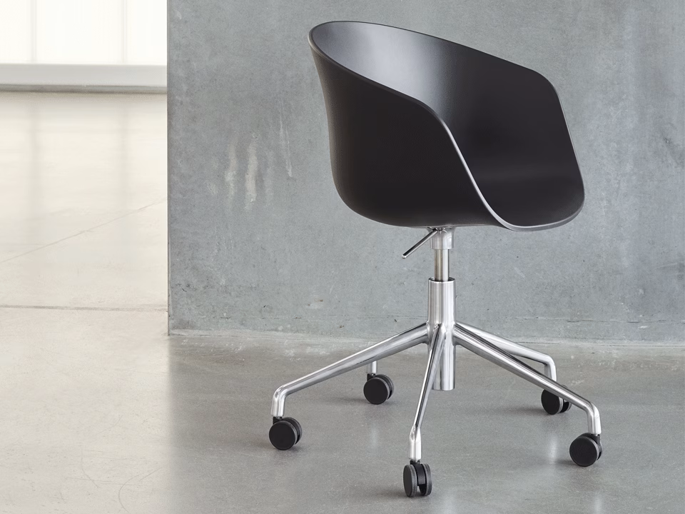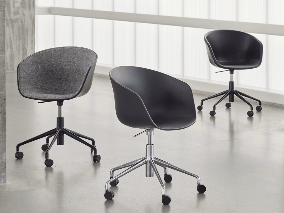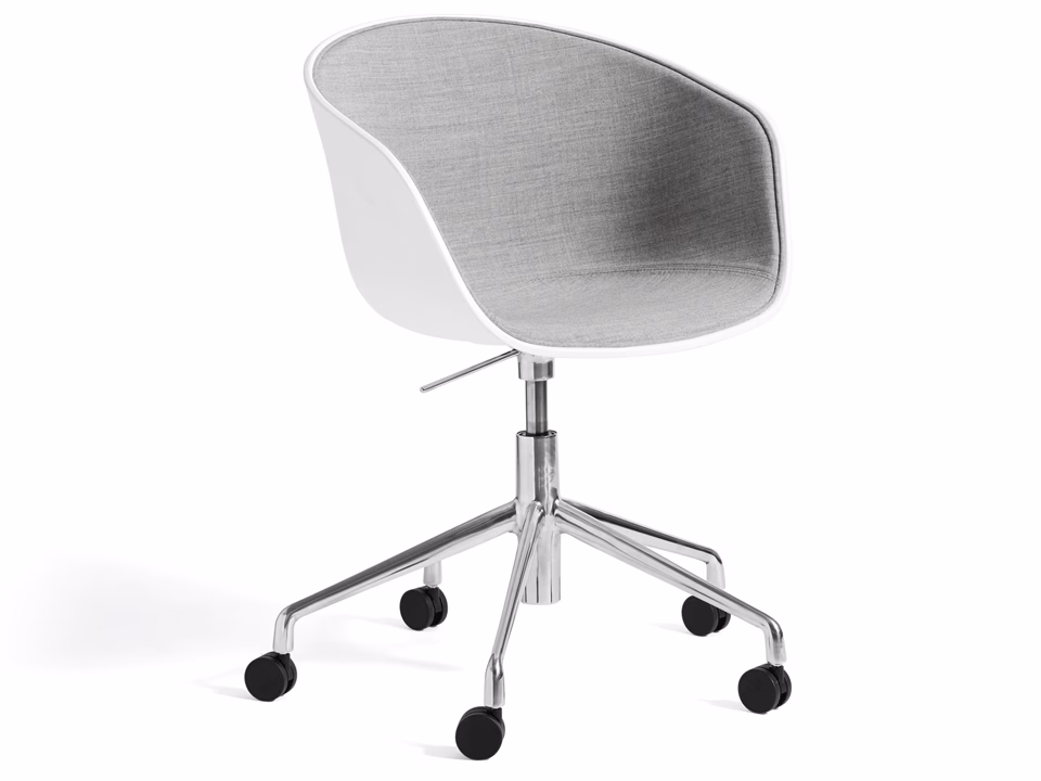 Perhaps the most functional chair of the series, the About A Chair AAC52 features a five-legged castor base equipped with a semi-automatic gas lift that can adjust the seat height from 42 to 56 cm. Just like the rest of the series, the aluminium base can be combined with the original, open seat or rounded shell to make the look as formal or relaxed as you like. A wide choice of colours and fabrics give you further options to adapt the chair to whatever environment you need.