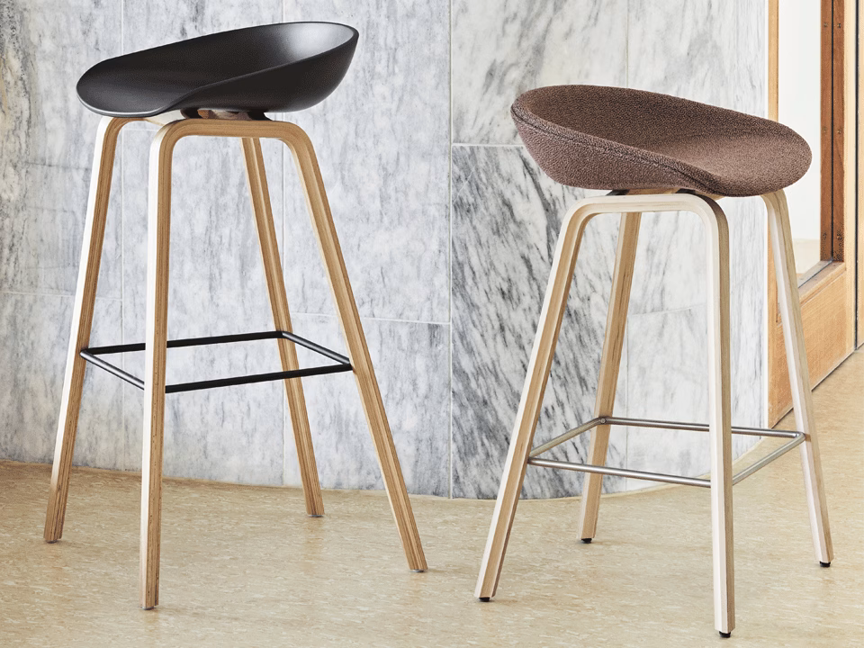 - Material: Injection moulded polypropylene seat with full upholstery with 10 mm foam. Low model is suitable for kitchen counters. High model is suitable for bar tables. Moulded beech plywood legs with top oak veneer. Stainless steel footrest is recommended for contract use.