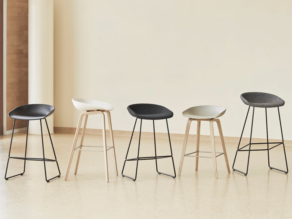 The bar stool About A Stool AAS33 has the same capacity for transformation as the other designs in the series, ranging from a minimalistic plastic stool to a more full-bodied upholstered version. With a curved backrest and long, elegant wooden legs, it enjoys a simple yet strong visual presence that makes it ideal as a bar stool in a public environment, as well as for informal meetings and meals. Available in two heights and in a range of wood finishes, colours and upholstery options.
