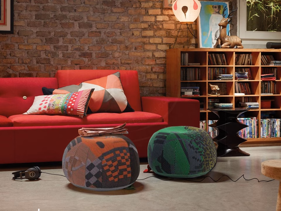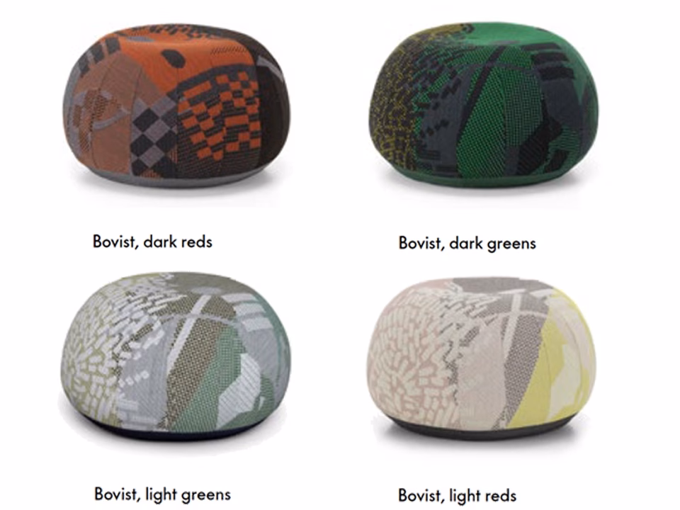 Bovist is a decorative floor pillow, stool and ottoman all in one. Its appealing shape and casual comfort are provided by the tapered radial seams around the sides and a compact filling of synthetic beads. The fabric cover features a lively pattern in a complex jacquard weave. The motif and colour scheme are inspired by the Vlinder sofa and its multi-layer design. Bovist is therefore not just a striking solo piece or an attractive ottoman for any type of upholstered furniture, but also an ideal companion for Vlinder.