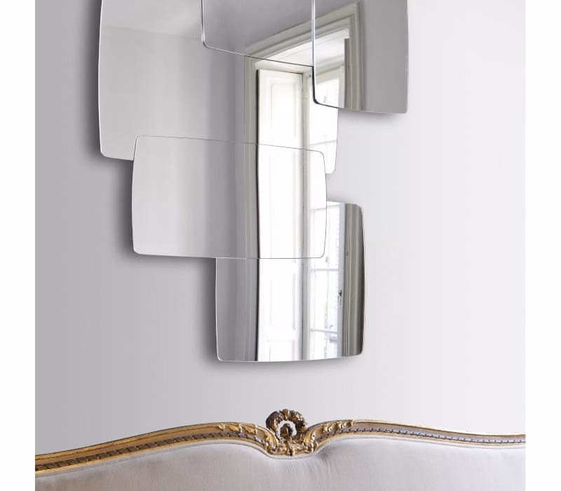 Amalgamation of mirrors of various dimensions to create one large and highly original mirror which would not look out of place in a hallway, above a contemporary fireplace, or even in a bathroom.