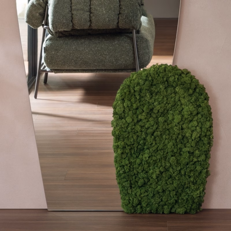 An object that does not need any explanation to understand the origin of its name: with its original design, the Cactus mirror brings a touch of irony to the environments in which it is placed.Cactus is composed of two overlapping elements: a larger silhouette that characterises the mirror itself and a smaller insert in four different finishes of ceramic or composed of forest green lichen, for an even stronger reference to the true essence of the green cactus.