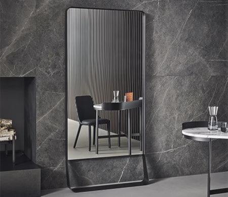 The rectangular shape and the rounded corners are the mai characteristics of the Narciso mirrors, available in two different sizes. The profile, a metal frame available in different finishes, is transformed in the bottom section, widening towards the support base, thus creating an empty space between the mirror and the base resting on the floor. The frame can be chose in anthracite grey and black metal or in bronze, pearl gold, platinum and lead plus metal finishes.
