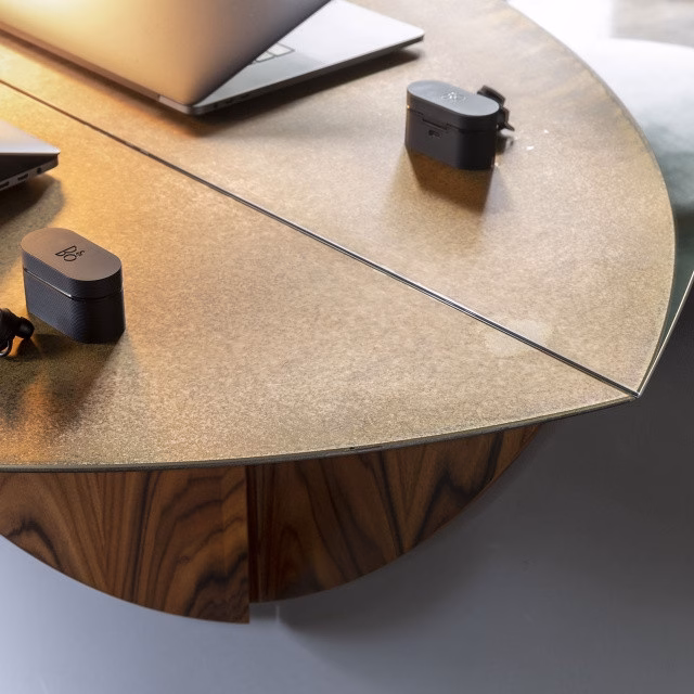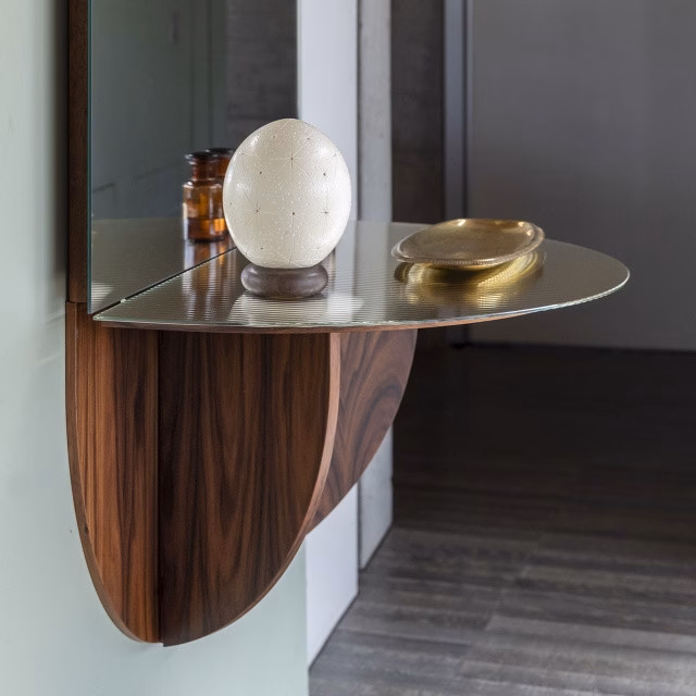 Mirror that becomes a console thanks to the folding top, a functional element in the entrance area, discreet and intimate in the sleeping area. With a minimal design, adorn by the elegant combination of the proposed finishes.