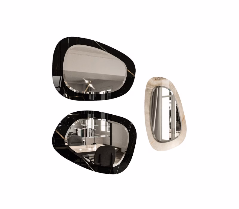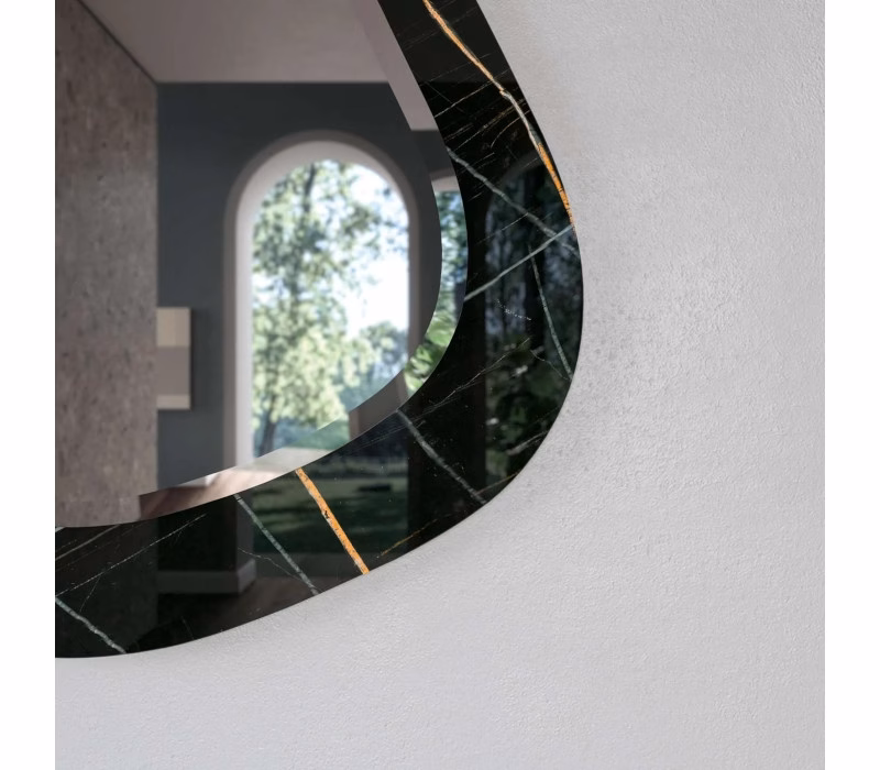 Mirror with an asymmetrical organic shape highlighted by a double depth and an elegant functional bevel.
