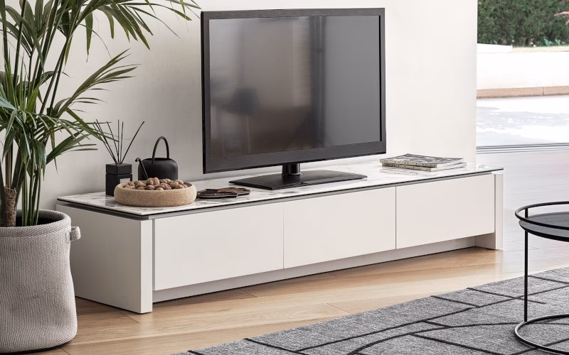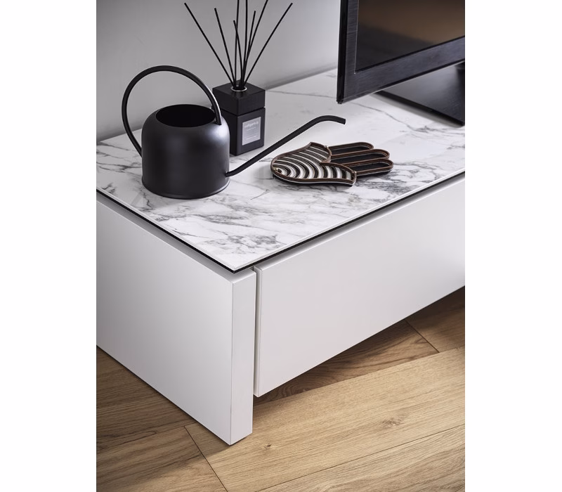 Model MAG TV bench. Wooden frame with two drawers and central compartment. MAG is a roomy sturdy wooden sideboard with a ceramic top, featuring an essential modern design. It can be perfectly combined with our tables. The two side drawers are handle-less and feature a push-pull opening mechanism. The central compartment, designed specifically to hold the decoder or DVD player, is closed by a drop-down door and contains a toughened glass shelf and a practical rear cable outlet. MAG is a TV bench that is perfect for a sophisticated living area and a contemporary setting.