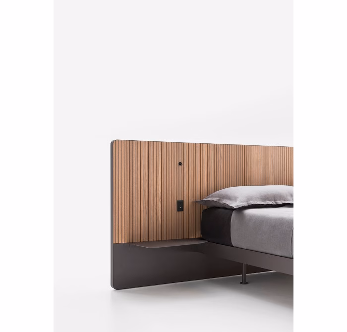 Righetto is a bed with a wooden headboard that can be fitted with a spotlight and metal shelf, and a wooden platform with metal feet. The headboard has an aluminium profile and two finishes, one for the top and the other to match the platform