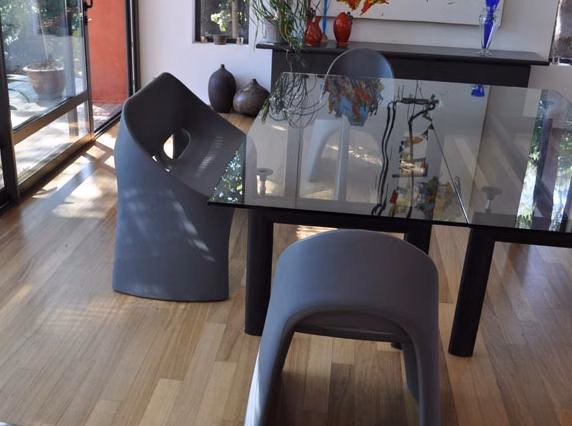 Mono-block of polyethylene that presents a welcoming silhouette with rounded edges. The open back allows comfort and ease. These are light, stackable, and can be used inside and out.