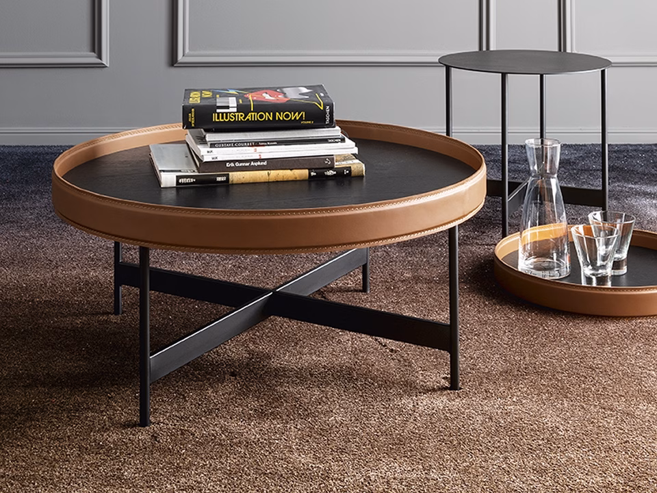 A new range of tables whose elegant simplicity is elevated by a harmonious aesthetic. ARENA has a frame in matt metal and top in stained wood rimmed with a strip of regenerated leather. This fashion-inspired detail embraces the table top, turning it into a private personal sphere – a virtual protective arena in which to retreat and take a break from the pressures of the day.