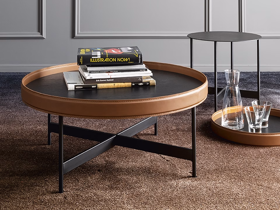 A new range of tables whose elegant simplicity is elevated by a harmonious aesthetic. ARENA has a matt metal frame and top in stained wood rimmed with a strip of regenerated leather. This fashion-inspired detail embraces the table top, turning it into a private personal sphere – a virtual protective arena in which to retreat and take a break from the pressures of the day. In this version, the table top can also become a handy removable tra
