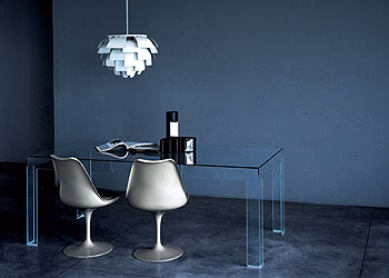 Elegant dining table obtained by glued thick tempered glass plates, cut with water jet and with 45° chamfered edge.
