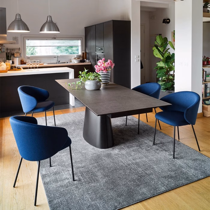 The sleek monoblock look will elegantly elevate any environment and suit any kind of décor. Ellisse is an extendable table with a ceramic top and monoblock base in coated curved sheet metal