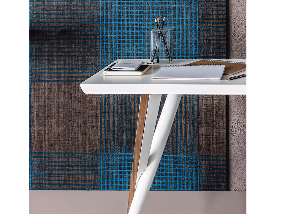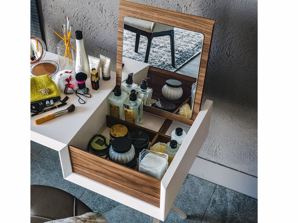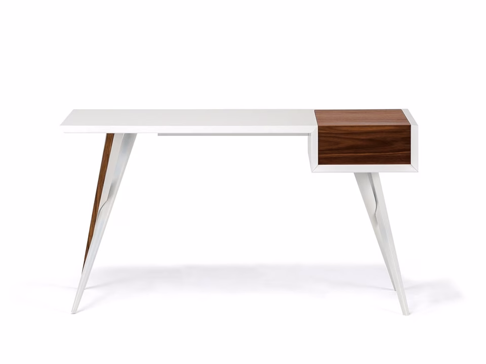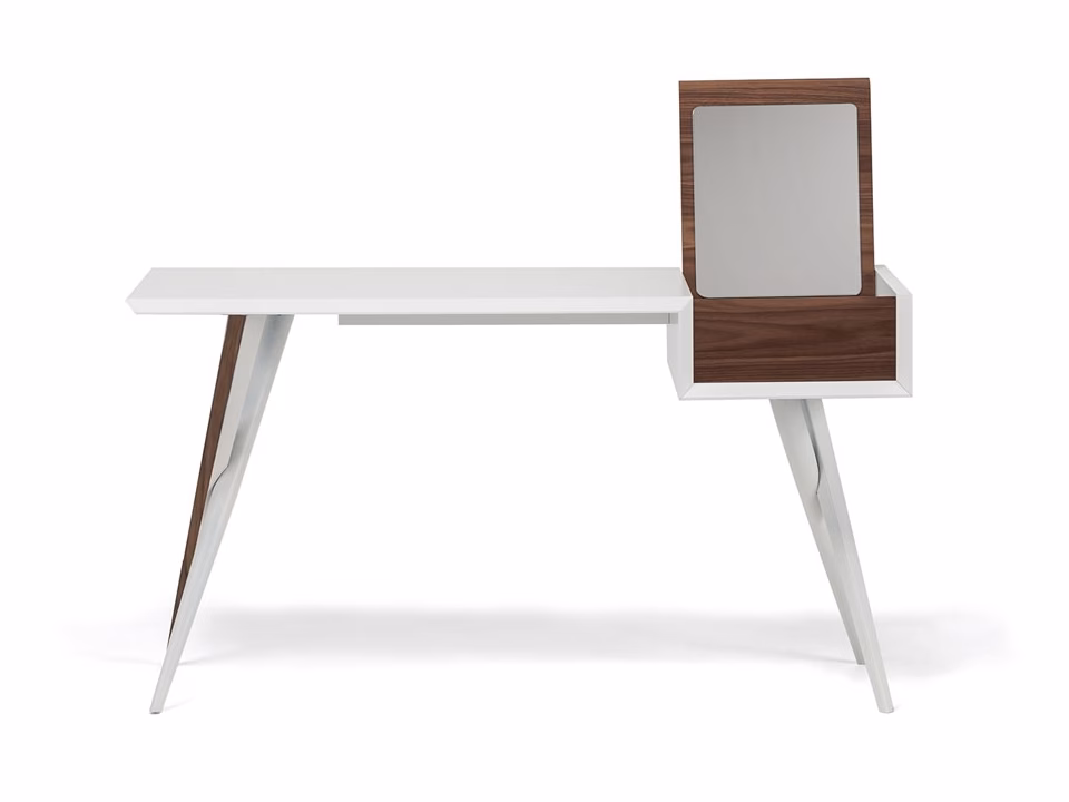 Desk with base in white (GFM71) or graphite (GFM69) embossed lacquered steel with profiles in Canaletto walnut (NC). Top in white (GF71) or graphite (GF69) embossed lacquered wood with container in Canaletto walnut (NC).