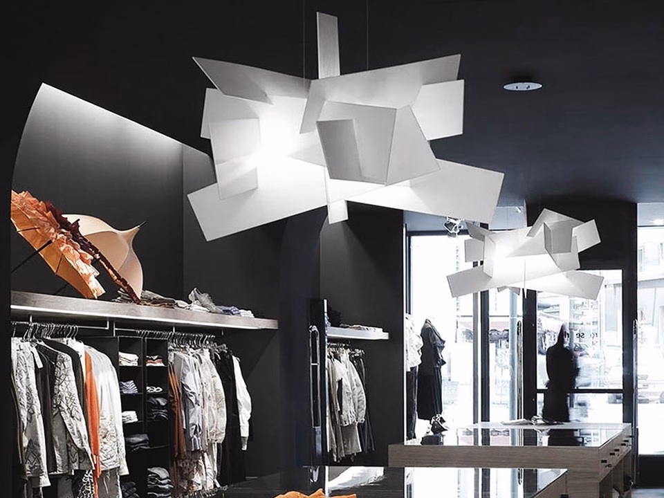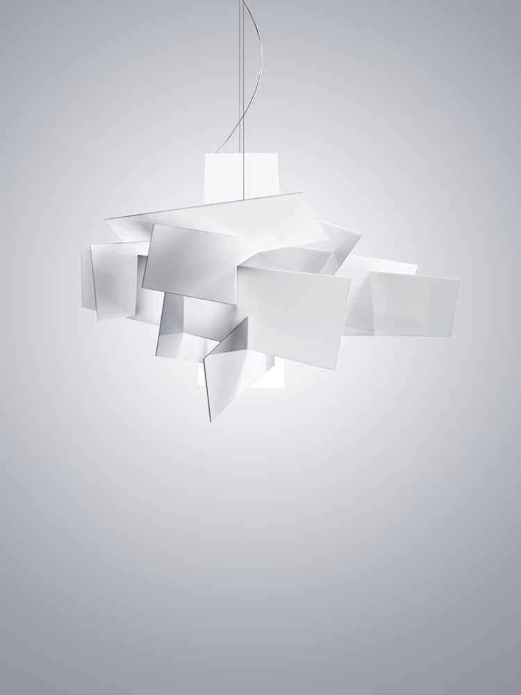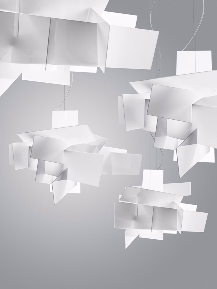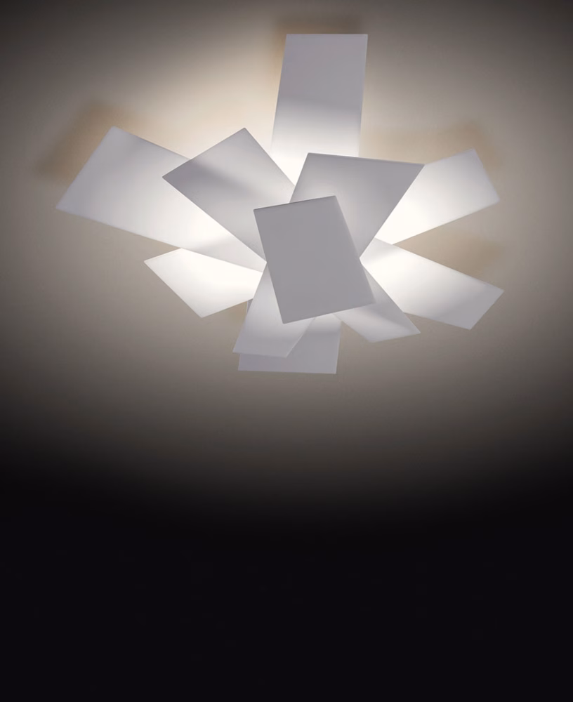 An apparently chaotic stack of surfaces, this ceiling lamp has a design featuring explosive creativity and dynamism.