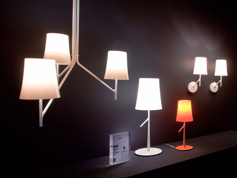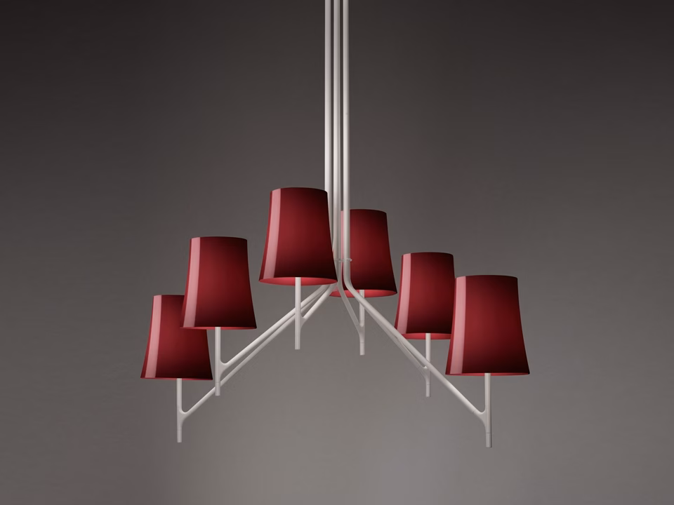 Birdie interprets the shape of the classic free-standing lampshade-lamp with a contemporary twist, translating it into a family of poetic ceiling lamps. Available with 3, 6 or 9 arms, Birdie can distinguish an entire room with its multiple games of shapes, colours and lights.
