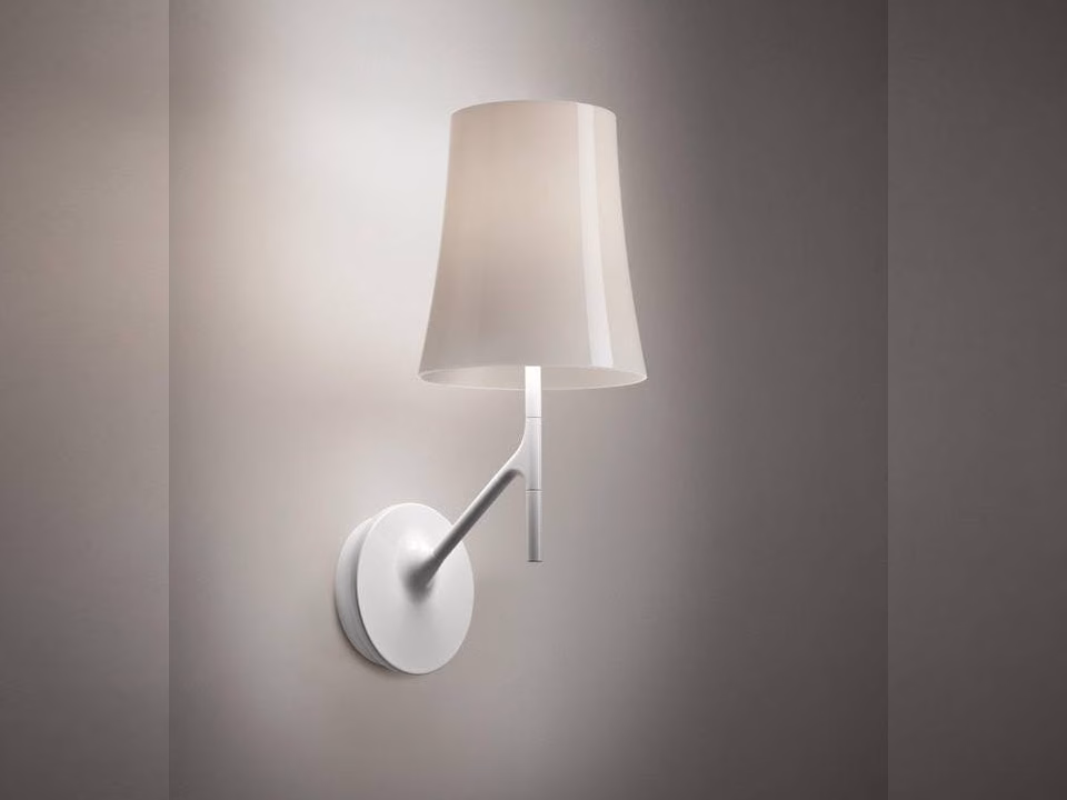 The Birdie family of lamps interprets the shape of the classic lampshade-lamp with a designer twist. The wall lamp version is a friendly, highly versatile presence thanks also to the availability in White or Grey diffuser colours.