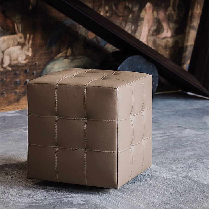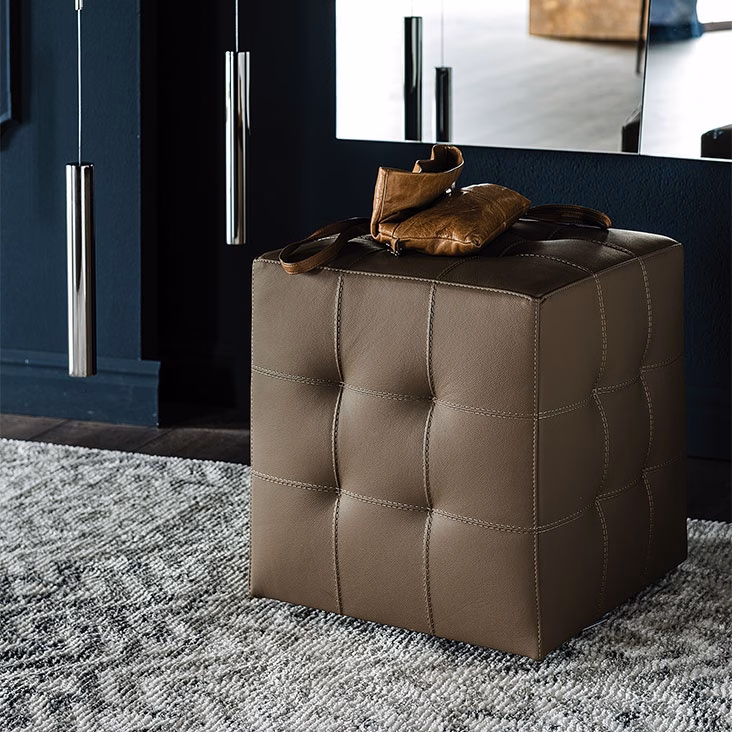 Pouf on wheels covered capitoné in synthetic nubuck, synthetic leather or soft leather as per sample card.