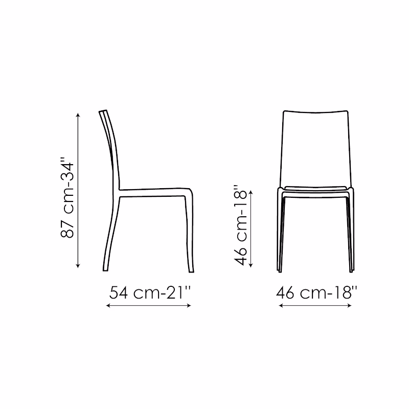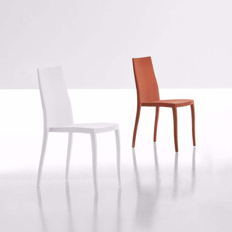 Stackable chair made entirely of transparent glossy polycarbonate or coloured glossy polyamide.
