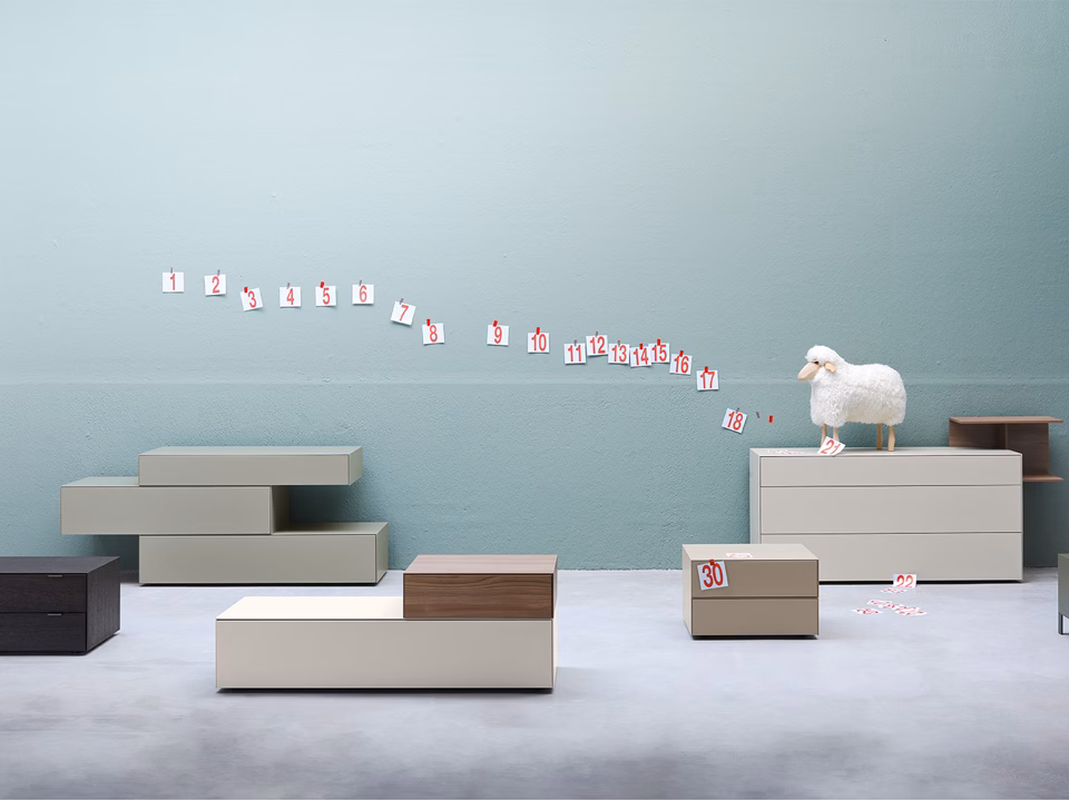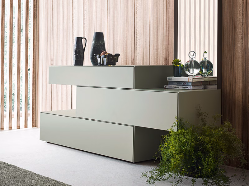 This piece is characterised by its sleek, minimalist lines. Fil is a modular bed unit which can be used in a wide array of compositions. There are two floor-standing options and it can be wall mounted. There are also two ways to open the units, either using the small, asymmetric metal handle or the push-pull mechanism.