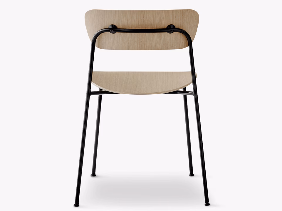 The chair is made from bend steel tubes and formpressed veneer. The veneer back and seat are finished with a PU lacquer. All chairs are equipped with an injection molded plastic stacking tray underneath the seat.