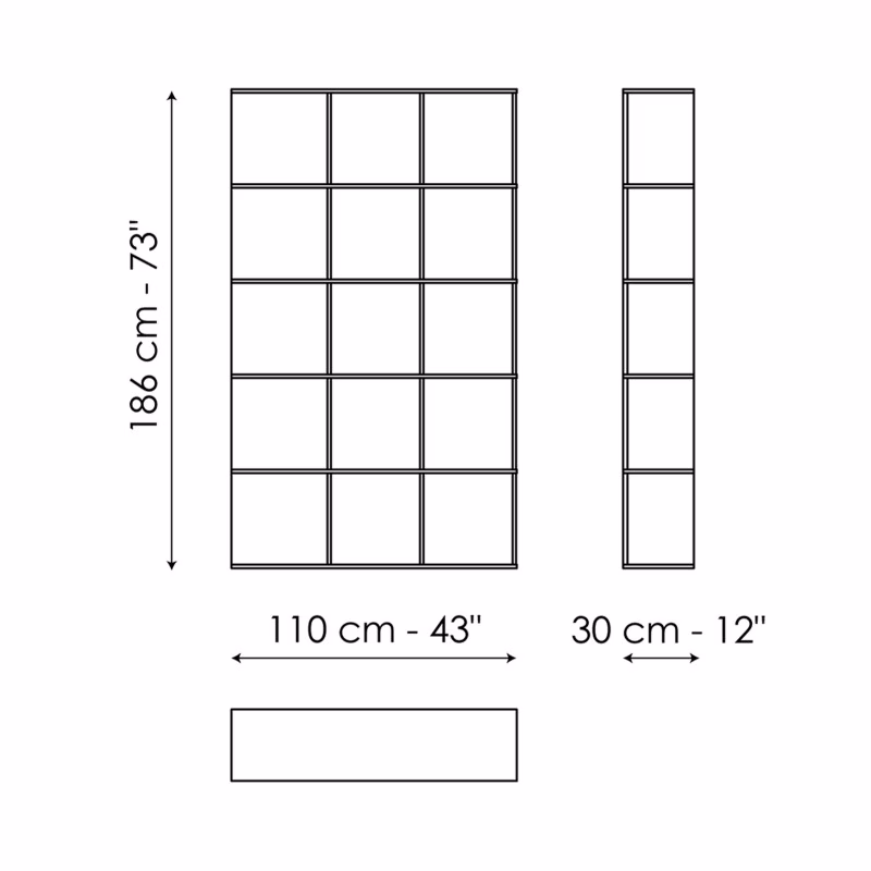 When combining the modules, the unique three-dimensional grid produces a very dynamic compositional effect thanks to the rotated arrangement of the vertical partitions which, in addition to defining the compartments, create a rhythmic unitary subdivision of the space with a minimalist appeal. The Illusion bookcase is wall-mounted, marking out the space.