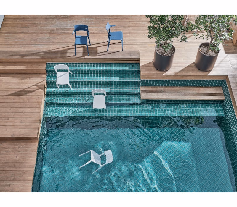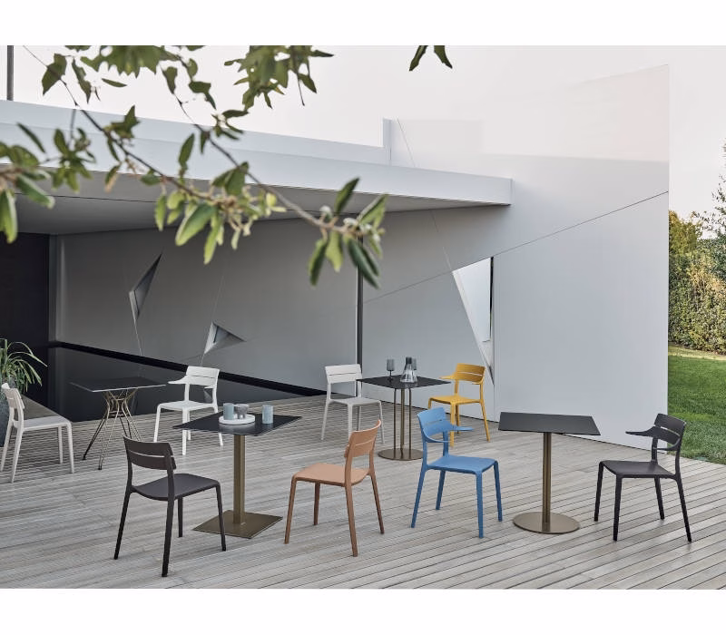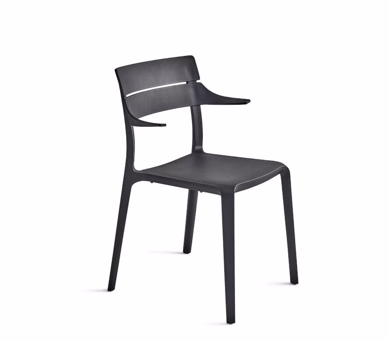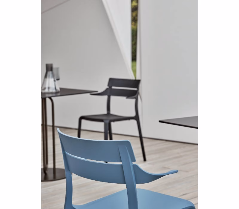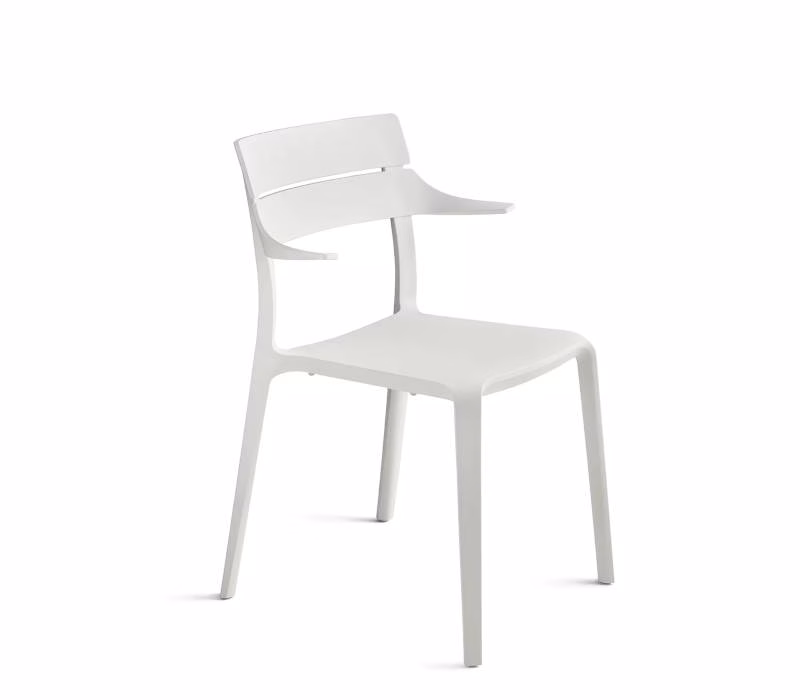 Stacking chair with arms in polypropylene and recyclable glass fibre.