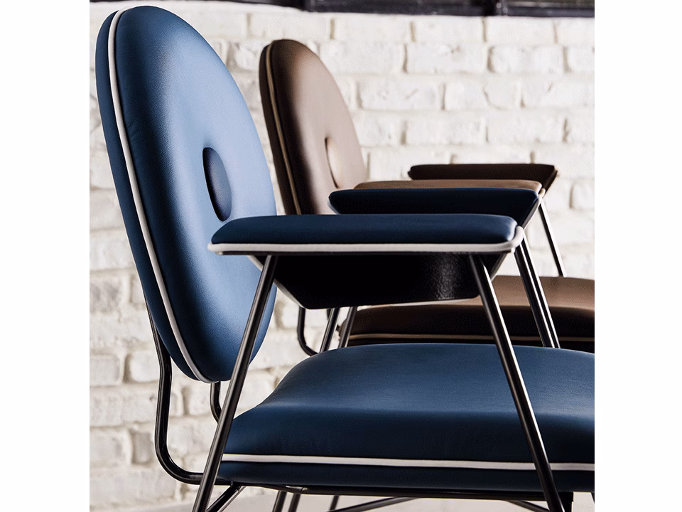 Chair with arms. Piping can be matching colour or contrast colour. Central button, arms, back seatback and under seat customized coverings.