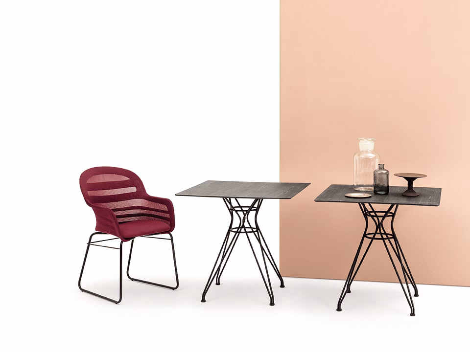 Back in elastic fabric with patterned net and Seat upholstered and covered in elastic fabric with uniform net or EcoLeather.