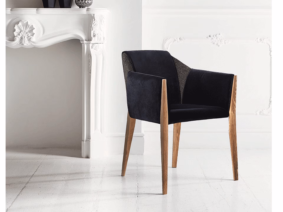 - Material: Chair and chair with arms in solid Wood frame and upholstered.