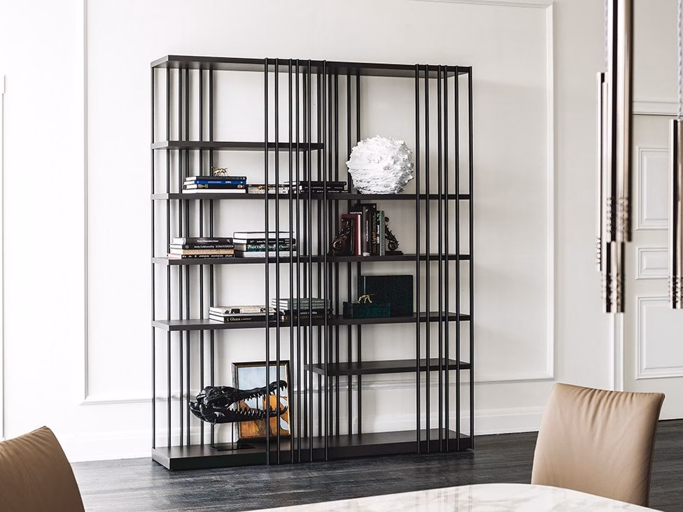 Modular bookcase with frame in white (GFM71), black (GFM73) or graphite (GFM69) embossed lacquered steel. Shelves in Canaletto walnut (NC) or burned oak (RB) or embossed white (GF71) or graphite (GF69) painted wood. The frame can be assembled right or left (as one wants).