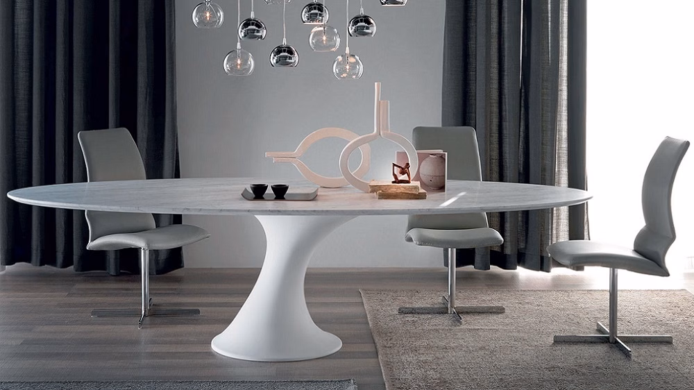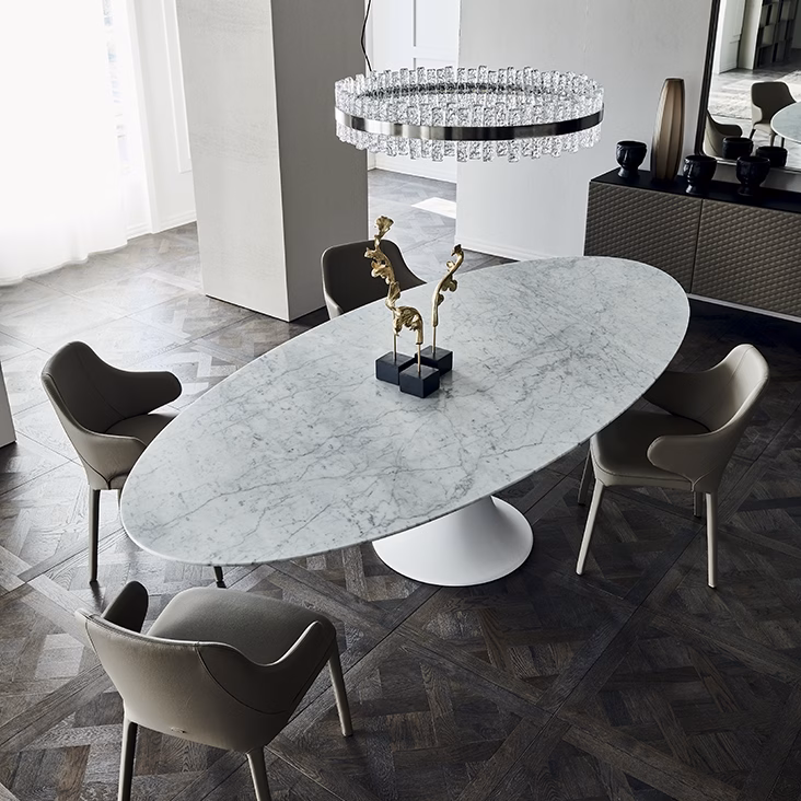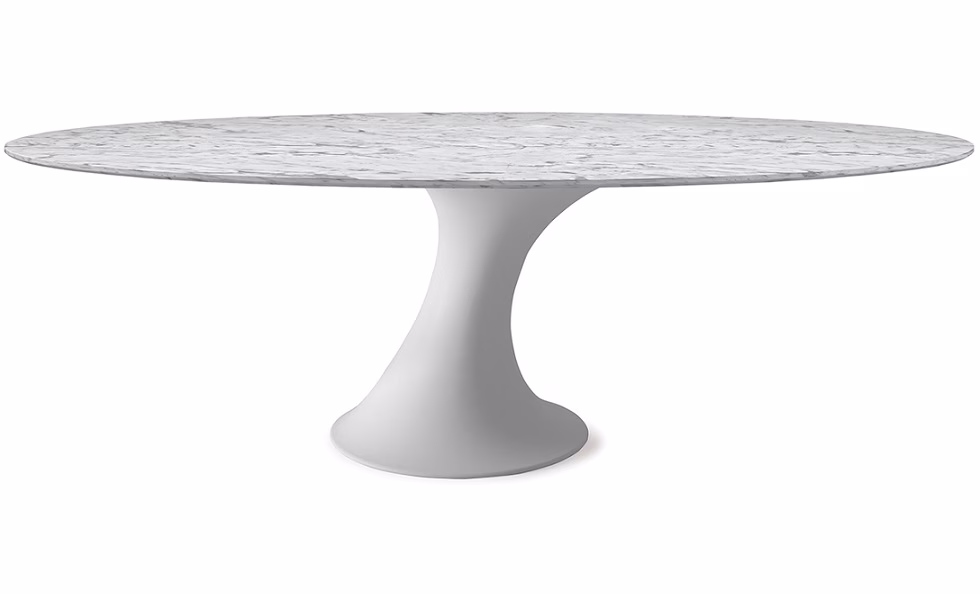 Table with matt white cristalplant base. Top in matt white Carrara (BCO) marble. Optional central swiveling tray Lazy Susan.