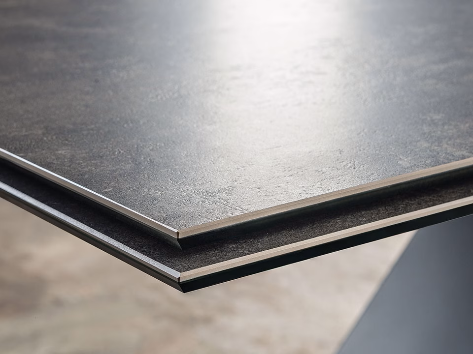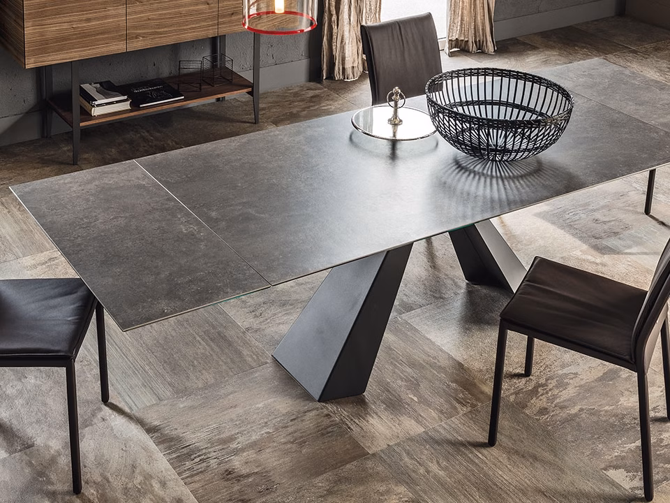 Extendible table with base in titanium (GFM11), bronze (GFM18), graphite (GFM69), white (GFM71) or black (GFM73) embossed lacquered steel. Marmi ceramic top and extensions in Alabastro (KM02), Supreme (KM03), Ardesia (KM04), matt Golden Calacatta (KM05), glossy Golden Calacatta (KM06), matt Portoro (KM07), glossy Portoro (KM08), glossy Sahara Noir (KM09), Emperador (KM10), Makalu (KM11), Breccia (KM12) or Arenal (KM13).