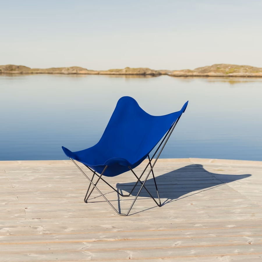It’s probably the only proper outdoor butterfly chair in the World. This beautiful, lightweight BKF has a cover made in the famous Sunbrella fabric that is highly resistant to UV light and rain. The frame has a zinc protection under its coat to protect it from rust.