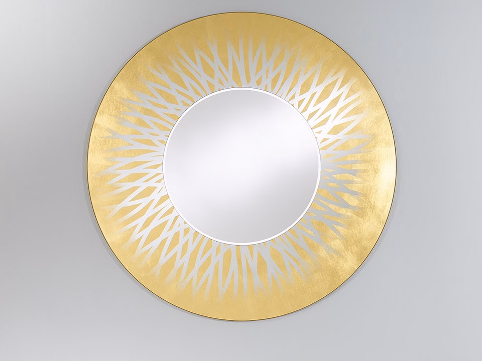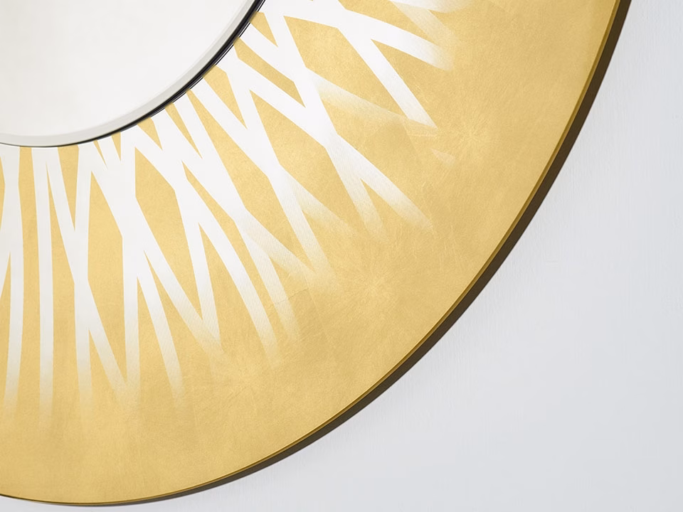 Zora brings the sun into your home. With our outstanding know-how in the field of screen printing, we are able to achieve the most surprising effects. The sunrays playfully burst from behind the central mirror to spread across the warm golden background. The atmosphere this mirror brings to your interior is almost dazzling.