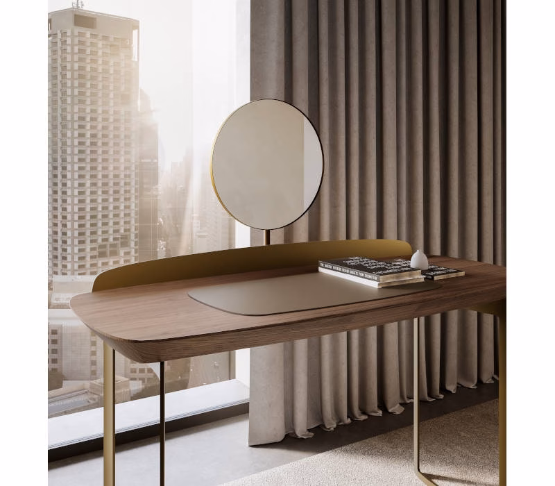 Icon Vanity is the modern dressing table with a refined and simple style: the ideal solution for your intimate corner. This piece of furniture can be used both as a writing desk and a makeup station, and it is made with a metal base and frame for the top, and a Canaletto walnut wood top. The great functionality of this dressing table is enhanced by the 6 mm thick beveled extra-clear mirror. Whether you decide to adorn it with perfumes, candles, makeup, jewelry, or cosmetics, it does not matter: Icon Vanity will enrich any bedroom environment. To complete the furnishing of this dressing table, choose the Willy pouf and the Vida floor lamp.