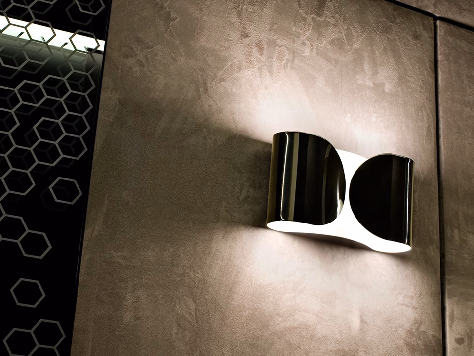 Wall lamp providing direct/indirect/partially diffused light. Wall fitting in powder-painted polished white pressed steel. Diffuser in powder-painted polished. Two nylon injection molded white lamp holder supports.