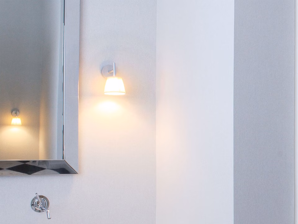 Wall sconce providing diffused lighting. Acid-etched pressed borosilicate glass internal diffuser. Plissé cloth shade. Gray painted die-cast aluminum diffuser and lamp support. Gray painted, injection-molded polycarbonate wall fitting and rose.