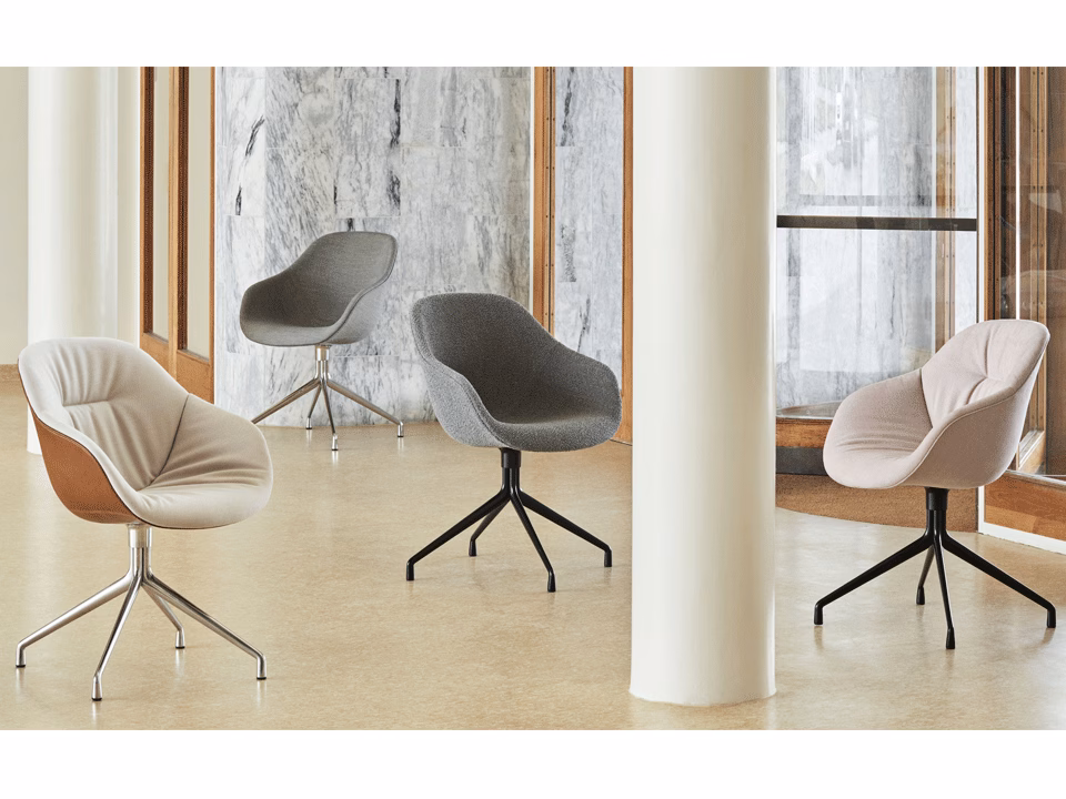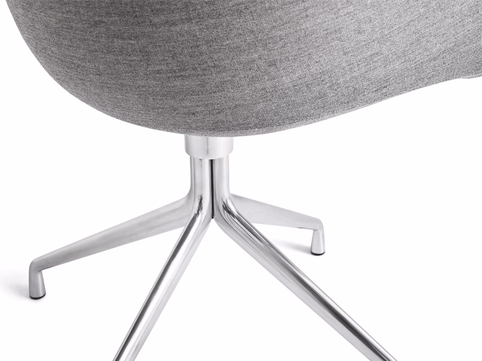 Featuring a swivel base in aluminium, the AAC 121 has a slightly more formal expression than the other variants in the series. Retaining the same high backrest and generous seat that characterises the series, this design features a functional base with legs that fan out from the centre. The base is available in either polished or powder-coated black aluminium, and the shell comes in a variety of upholstery options, providing a multitude of design combinations that give this series versatility in a wide range of corporate, public, and private contexts.