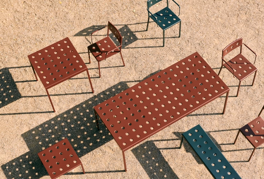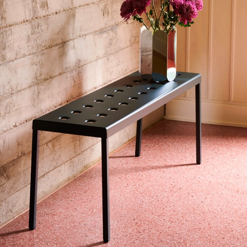 Designed for HAY by Ronan and Erwan Bouroullec, the Balcony Bench is an elegant seating solution for outdoor use. The simple rectangular design is softened by the slender legs, with the multiple holes in the seat strengthening the construction, as well as creating a distinct expression. Made in powder-coated steel with an outdoor primer for optimal resilience and durability, Balcony is available in a number of different colour and size options, making it a versatile bench that can be used in all kinds of spaces, from small balconies and terraces to gardens and other larger outside areas.
