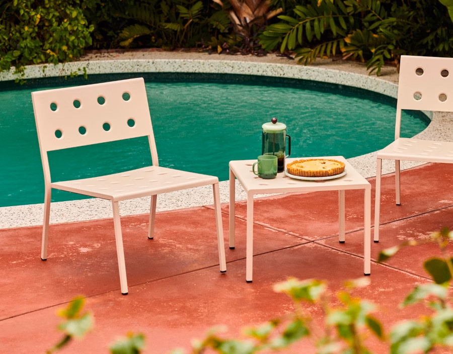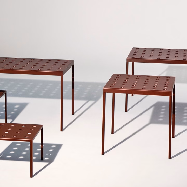 Designed for HAY by Ronan and Erwan Bouroullec, the Balcony Low Table is an elegant side table for outdoor use. The simple square design is softened by slender legs, with the multiple holes on the table’s surface strengthening the construction, as well as creating a distinct expression. Made in powder-coated steel with an outdoor primer for optimal resilience and durability, Balcony is available in a number of different colour and size options, making it a versatile table that can be used as an extra seat or storage surface in all kinds of outdoor spaces.