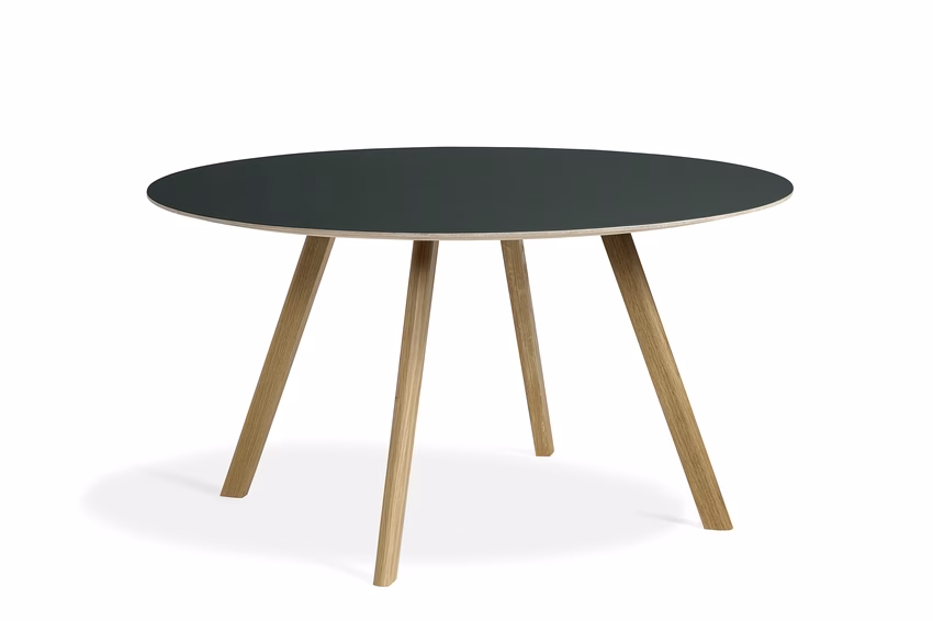 Sharing the same characteristic angled legs as the rest of the Bouroullec brothers’ Copenhague range, the CPH 25 table feature a round tabletop that softens the engineered expression. Equally suitable for intimate meetings and larger, café-like environments, this versatile table has an ability to blend into private homes as well as public spaces. The tables come in a variety of heights and sizes and are available in stained, soap-finished and lacquered oak with tabletops in veneer, laminate or linoleum.