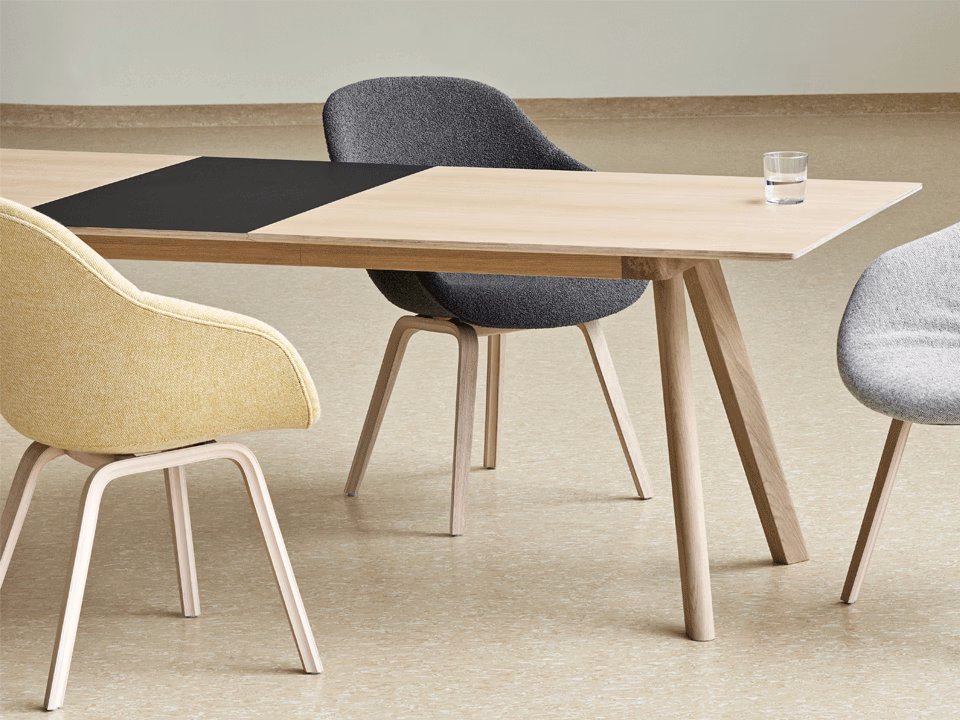 Supplementary extension leaves can easily be inserted into the table’s central sliding mechanism, allowing the table to be extended to the required length. The table’s flexible length makes it suitable for offices and public contexts, as well as workspace or dining solutions in home environments. CPH30 Extendable is available in a number of sizes with an oak frame in different finishes, and the tabletop comes in a variety of wood, laminate or linoleum options. The extension leaves can be purchased separately. Please note that colour difference will occur between table tops and leaves within our standard quality and is therefore not considered as a claim.