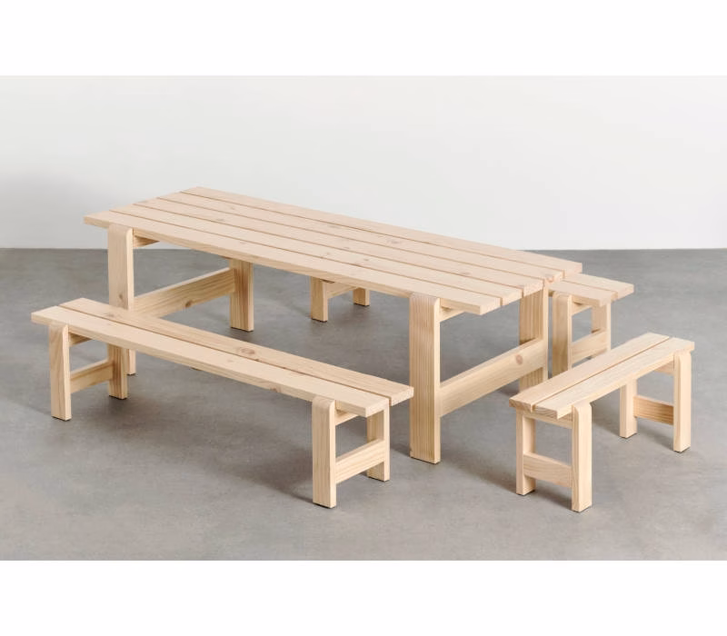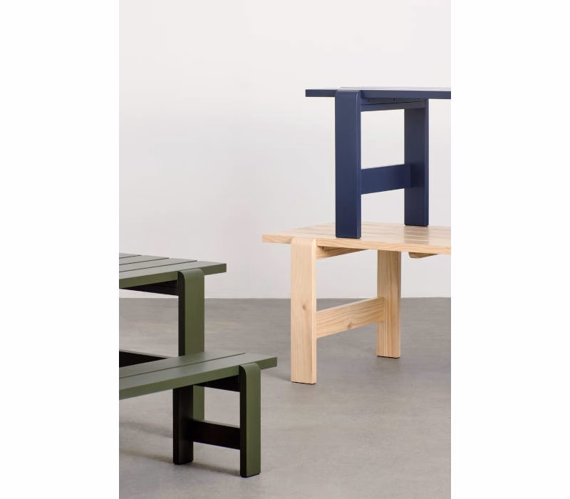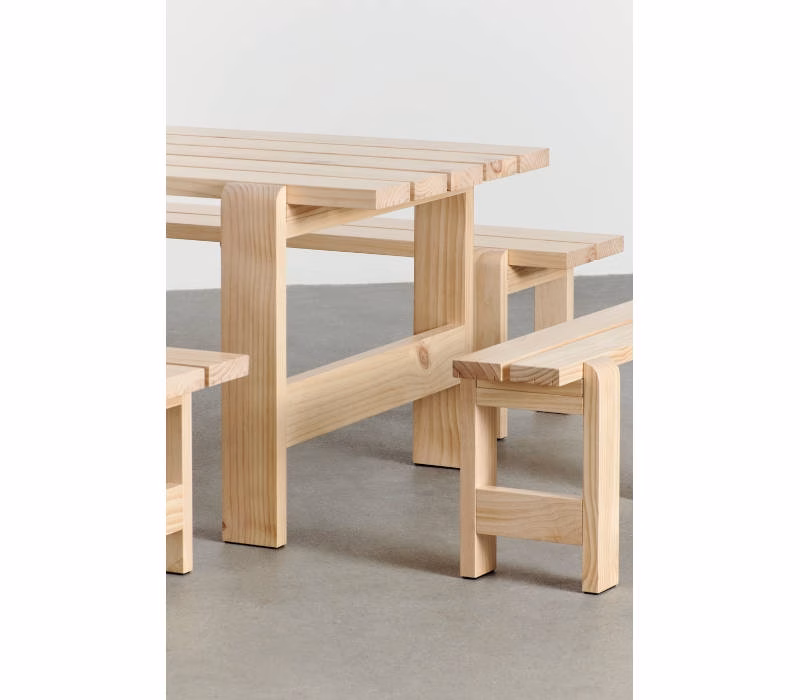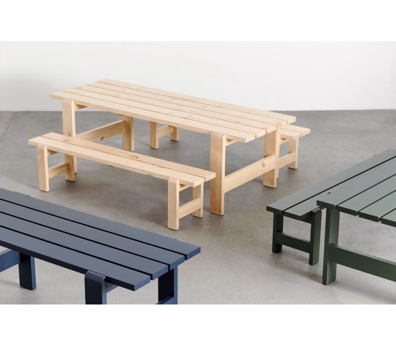 Hannes & Fritz’s Weekday Bench was inspired by their impromptu solution to a lack of seating at a dinner party. Retaining the original idea of bringing people together, the Weekday Bench combines a solid, robust presence with softly rounded joints, conveying a sense of warmth and familiarity that invites shared dining and a social atmosphere. Featuring the same simple construction as the classic picnic bench, it is made in strong, durable pine planks that will patinate beautifully and last for many years to come. The Weekday Bench’s strong yet universally appealing character combined with its water-based, weather-resistant surface treatment makes it suitable for outside use in a wide range of settings, from cafés and public parks to private or shared gardens. Available in different sizes in solid pine in a variety of finishes and colours. The benches can also be supplemented with seat cushions in selected textiles for extra comfort.