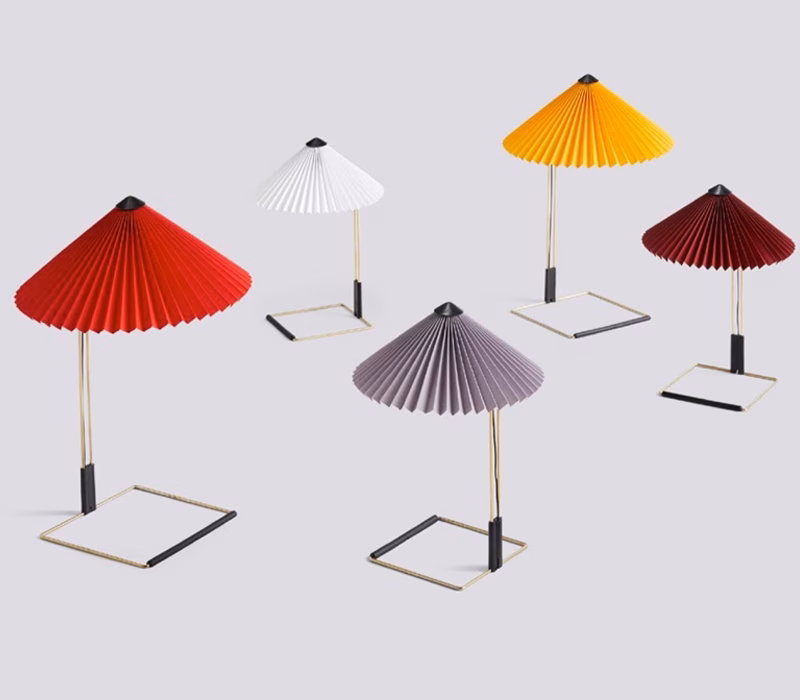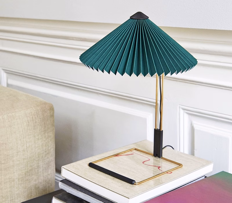 The Matin table lamp offers a contemporary yet poetic design, with a construction that combines visual delicacy with physical robustness. It consists of a steel wire bent frame finished in polished brass with matte black hardware, and is paired with a pleated cotton shade in a variety of vibrant colours. The light source is an integrated LED, offering a diffused downlight which is accompanied by a digital in-line dimmer control to adjust the output of light if required.