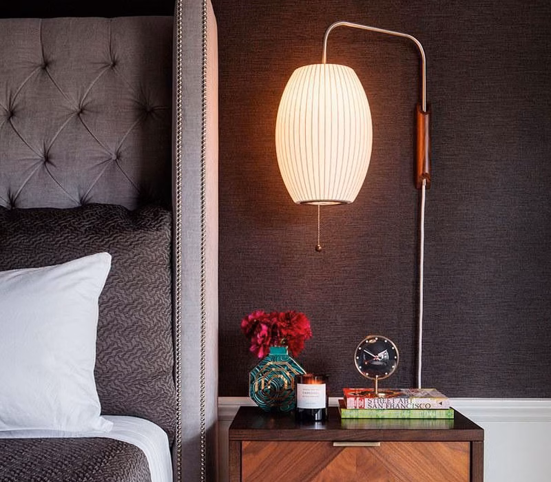 The Nelson Cigar Wall Sconce is part of the Nelson Bubble Lamp series. A walnut wall mount and steel arm attach the elongated, spherical shade to a wall, filling any interior with a warm, diffused light. The arm can be adjusted left to right and up and down, without having to change its position on the wall..