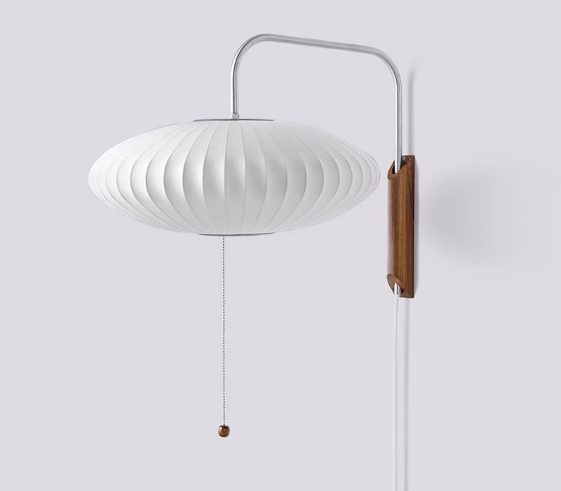 The Nelson Saucer Wall Sconce is part of the Nelson Bubble Lamp series. A walnut wall mount and steel arm attach the wide, saucer-shaped shade to a wall, filling any interior with a warm, diffused light. The arm can be adjusted left to right and up and down, without having to change its position on the wall.