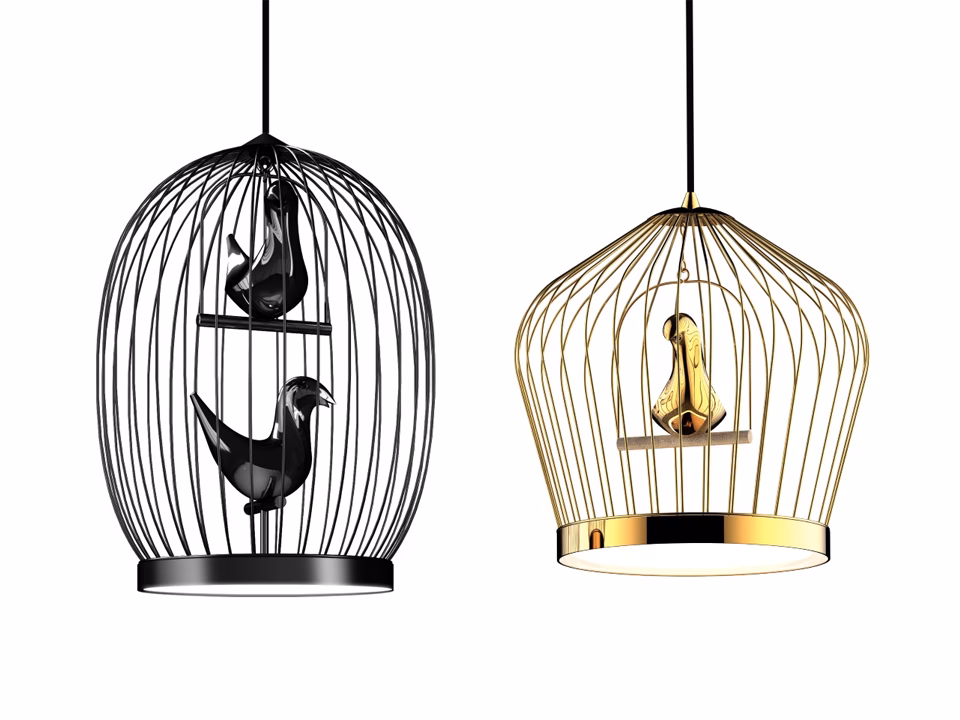 The little birds are made of hand decorated ceramics, black painted or plated in 24 carat gold; the structure of metal rod black painted or gold plated. The LED lighting fixtureis on the base of the cage, covered by a double polycarbonate shielding, that on the one hand illuminates the room and on the other hand illuminates the inside of the cage.