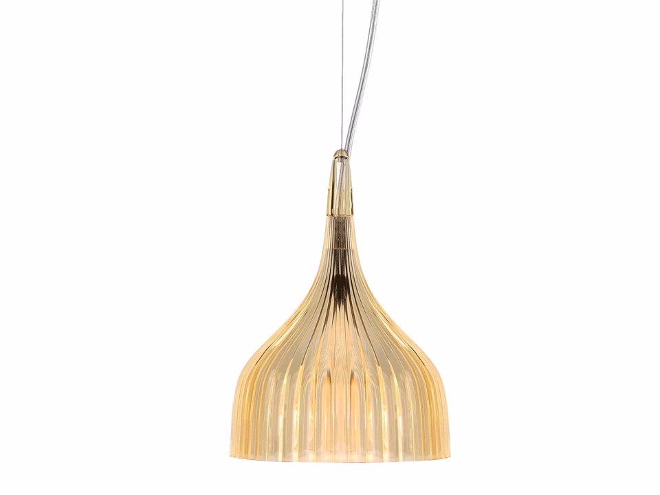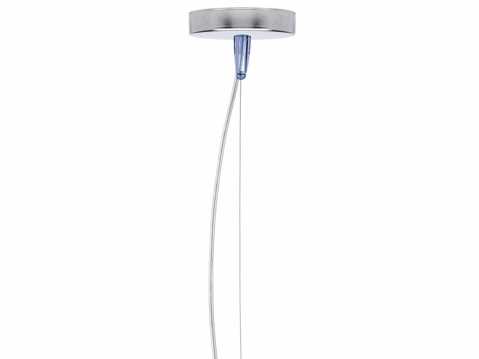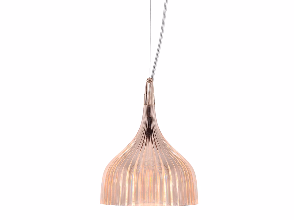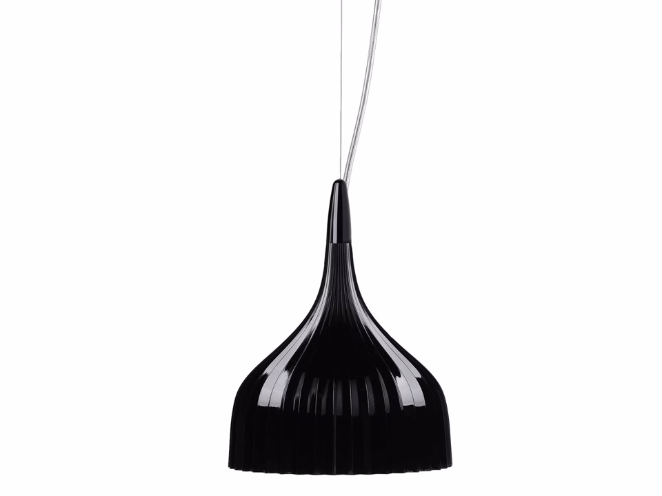 A lamp of simple and essential design, available in two versions, wall sconce and suspension lamp. The wall sconce is composed of a rosette lampshade in pleated polycarbonate available in several colours with an 11 cm chrome arm.
