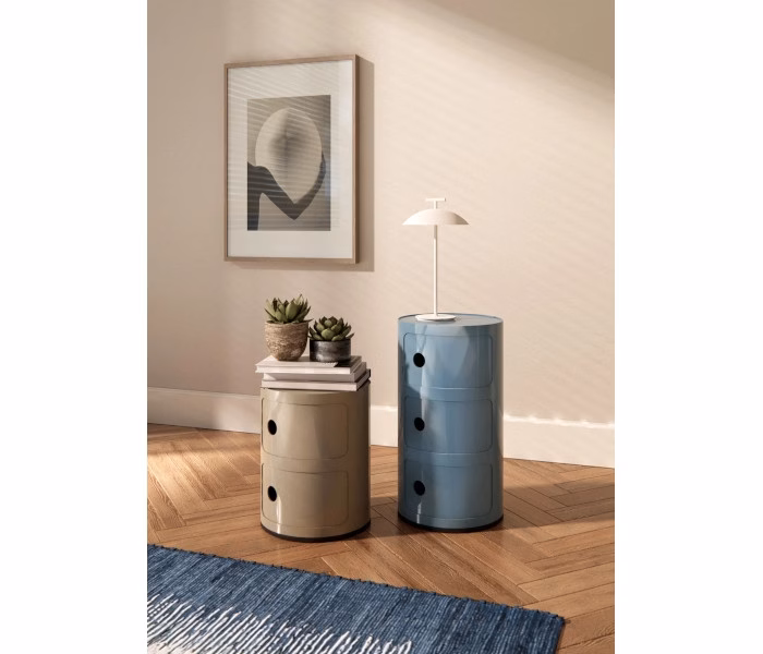 The modular elements were designed to meet different needs and to fit perfectly into every room in the home. Componibili first appeared in 1967 and have become a timeless furnishing classic. Today’s Componibili are 32 cm in diameter. Thanks to fixed compositions of two, three or four elements, these products are both functional and practical in all environments and now in 5 new colours